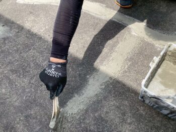 まずはパテでひび割れのほか、柵の支柱を支える束石の隙間などを埋めていきます。