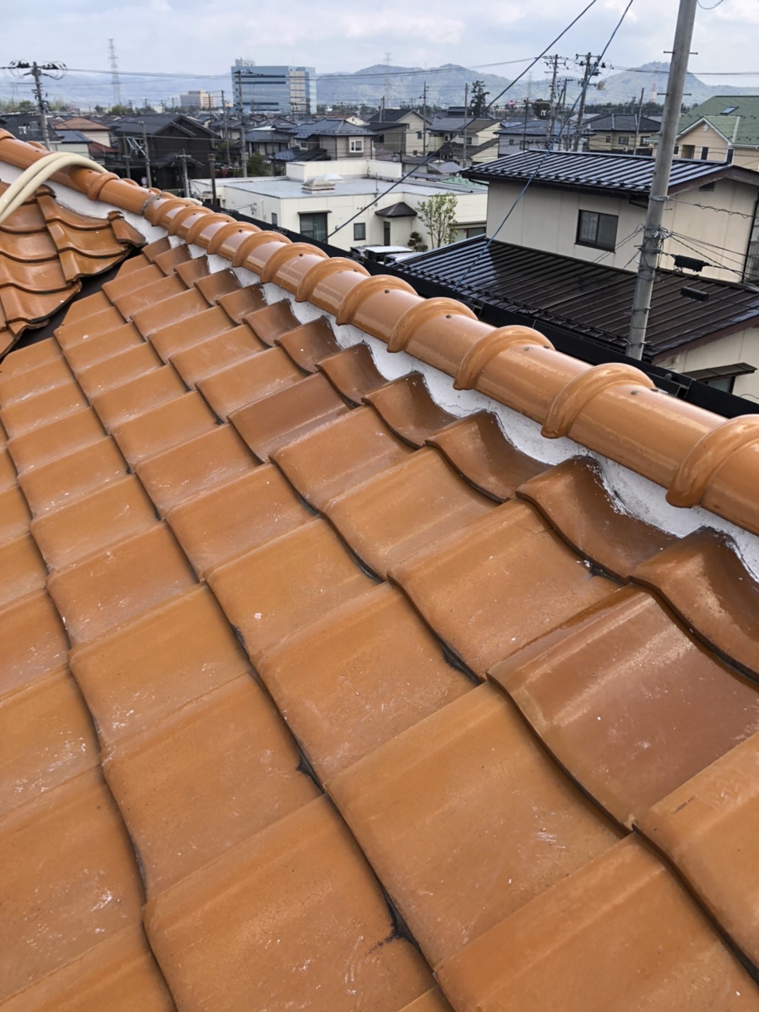 漆喰は、壁に塗るイメージが強いですが、実は屋根でも使用されています。写真にある白い部分が漆喰です。屋根におけ
